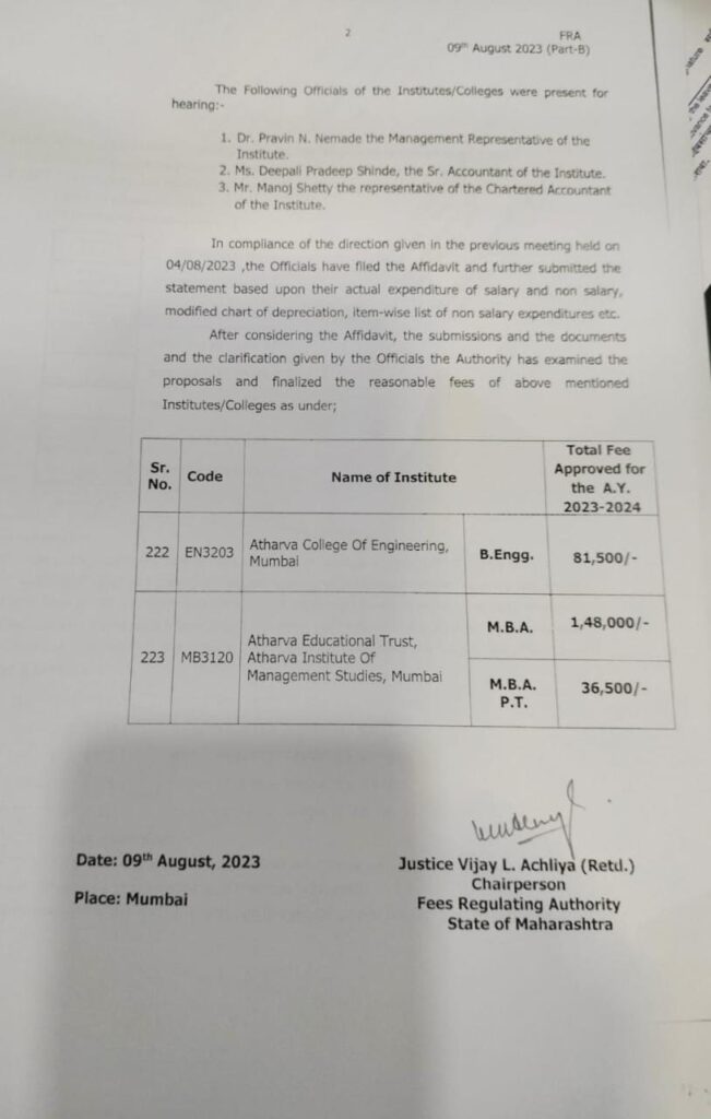 FE Fee structure approval for A.Y. 2023-2024 by FRA